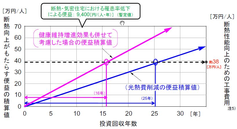 一方、まだ余り知られていない事実ですが、家の断熱性能と健康には深いかかわりがあり、しかるべき断熱性能の暖かい家に住むことで住まい手が健康になるという研究結果が出ています。室内の温度むらの少ない暖かい家に住むことで、一世帯あたり27,000円、国家負担分で考えると一世帯あたり59,000円の医療費の削減につながるという研究結果もあります。しかしこれには住宅の高断熱化(すなわち省エネ化)による燃料費の削減分は含まれていないため、実質的な節約金額はこれを大きく上回ります。ここでいう暖かい家と健康の相関性は、現在の住宅メーカーの標準レベルである「次世代省エネ基準」程度ではまだまだ小さく、それを更に上回る「トップランナー基準」レベルを超えた断熱性能の家で顕著になります(ちなみにEUの省エネ義務基準は日本のトップランナー基準すら大幅に上回ります)。今現在、人口1億2000万人のうち、約1億人は冬の間暖かい生活ができていないと言われるほど、日本人は世界的に見ても珍しいほど寒さを我慢して暮らしている国民であり、その犠牲の上に現在の家庭のエネルギー消費量の統計があることを忘れてはなりません。