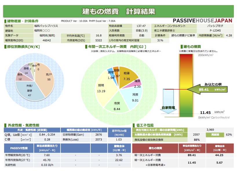 施工者は、たとえば同じ省エネ性能を発揮するために一番費用対効果の高い方法を探ることもできます。計算結果は一般の人にも大変分かりやすい表示方法となっており、住宅一棟一棟のキャラクターが正確に比較できるようになっています。たとえば同じ燃費の家でも、躯体のパッシブ性能が高いのか、それとも設備効率が高いだけなのか、はたまた太陽光発電で大量に発電して浪費したエネルギーを相殺しているのかが、一目瞭然なのです。