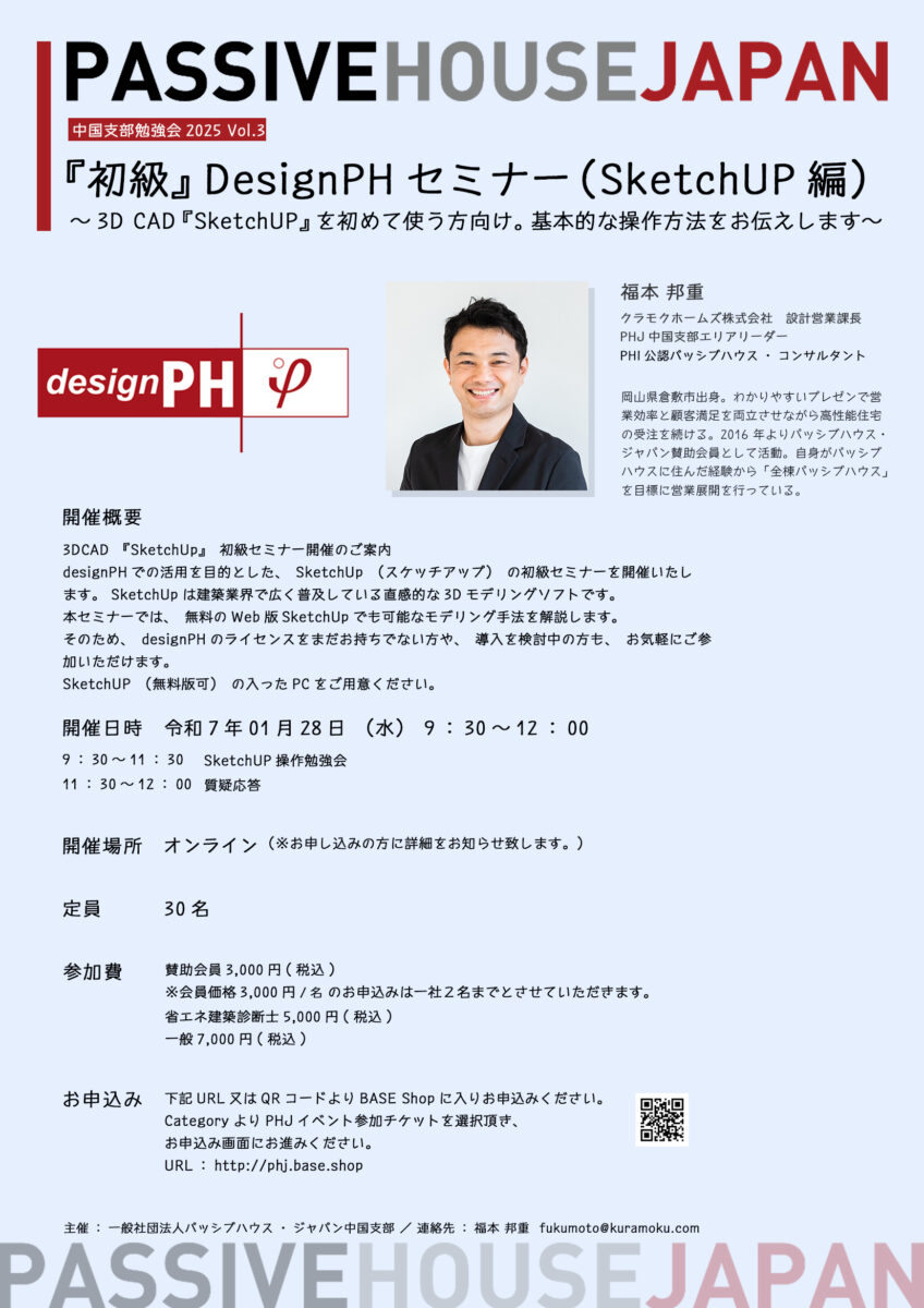 | 料金 | ▶賛助会員 3,000円(税込)/名 ※賛助会員価格は1社2名まで ▶省エネ建築診断士 5,000円(税込)/名 ※複数お申込の場合はお名前を明記ください。 ▶一般 7,000円(税込)/名 |